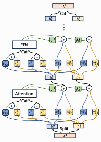 SHC allows for architectural flexibility. For example, let’s take a Transformer layer consisting of one Attention block (layer \(k\)) and one FFN block (layer \(k+1\)) with input \(\mathbf{H^{k-1}} = \begin{pmatrix} \mathbf{h_1} & \mathbf{h_2} \end{pmatrix}^T\), and set